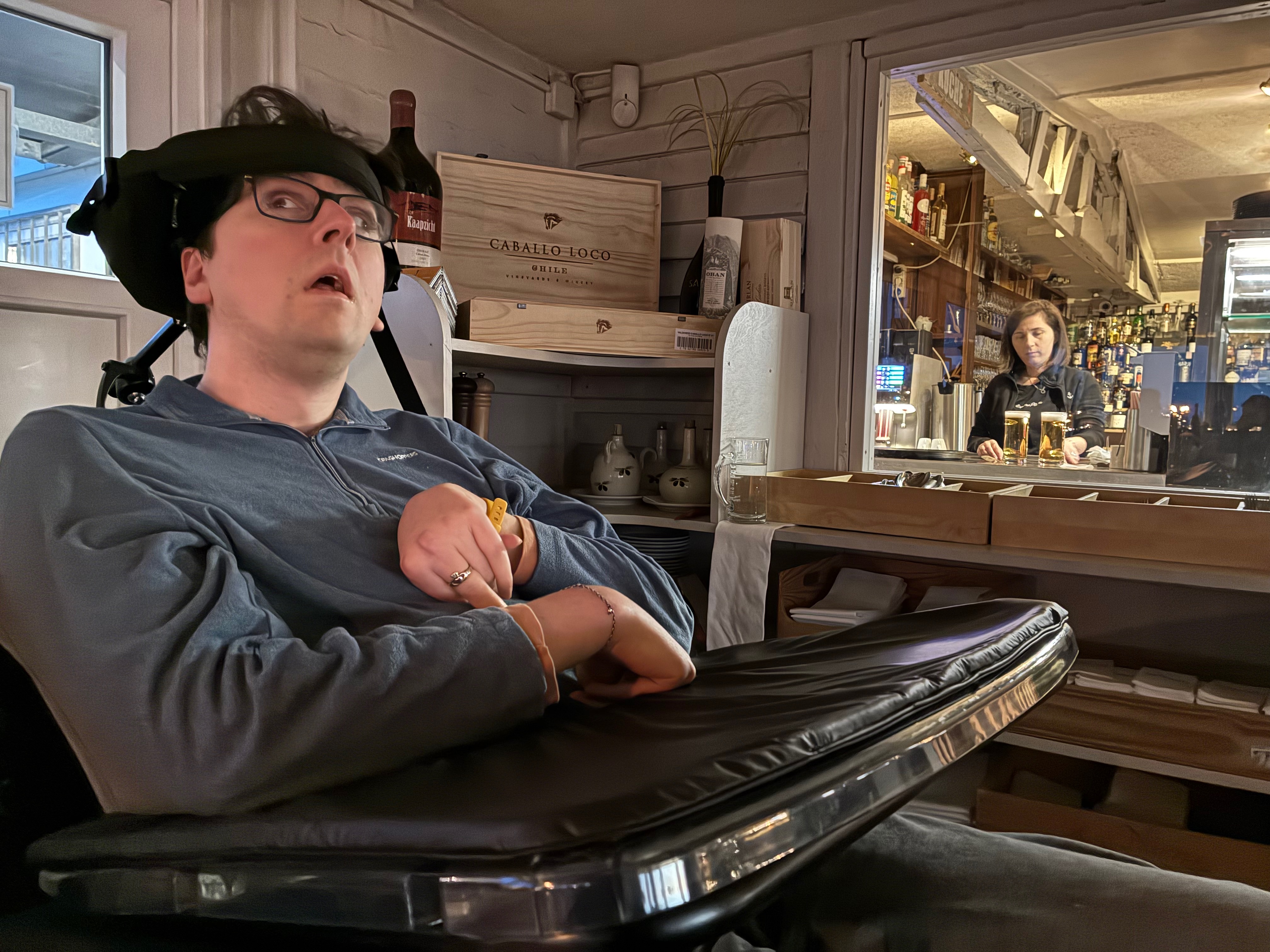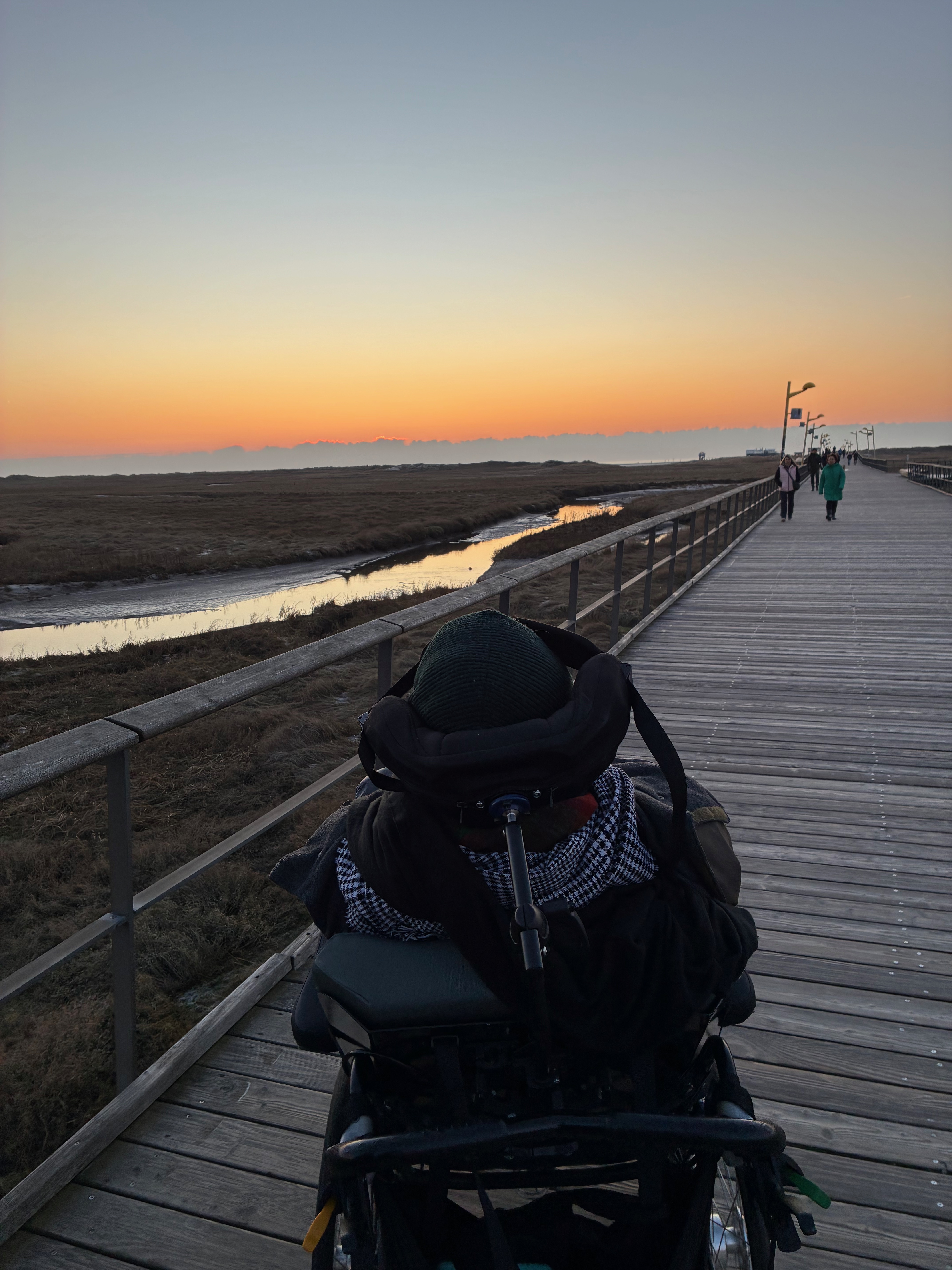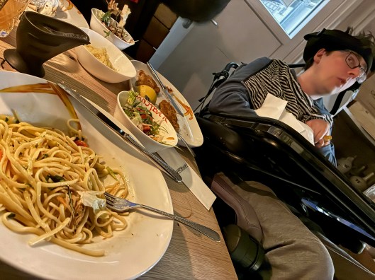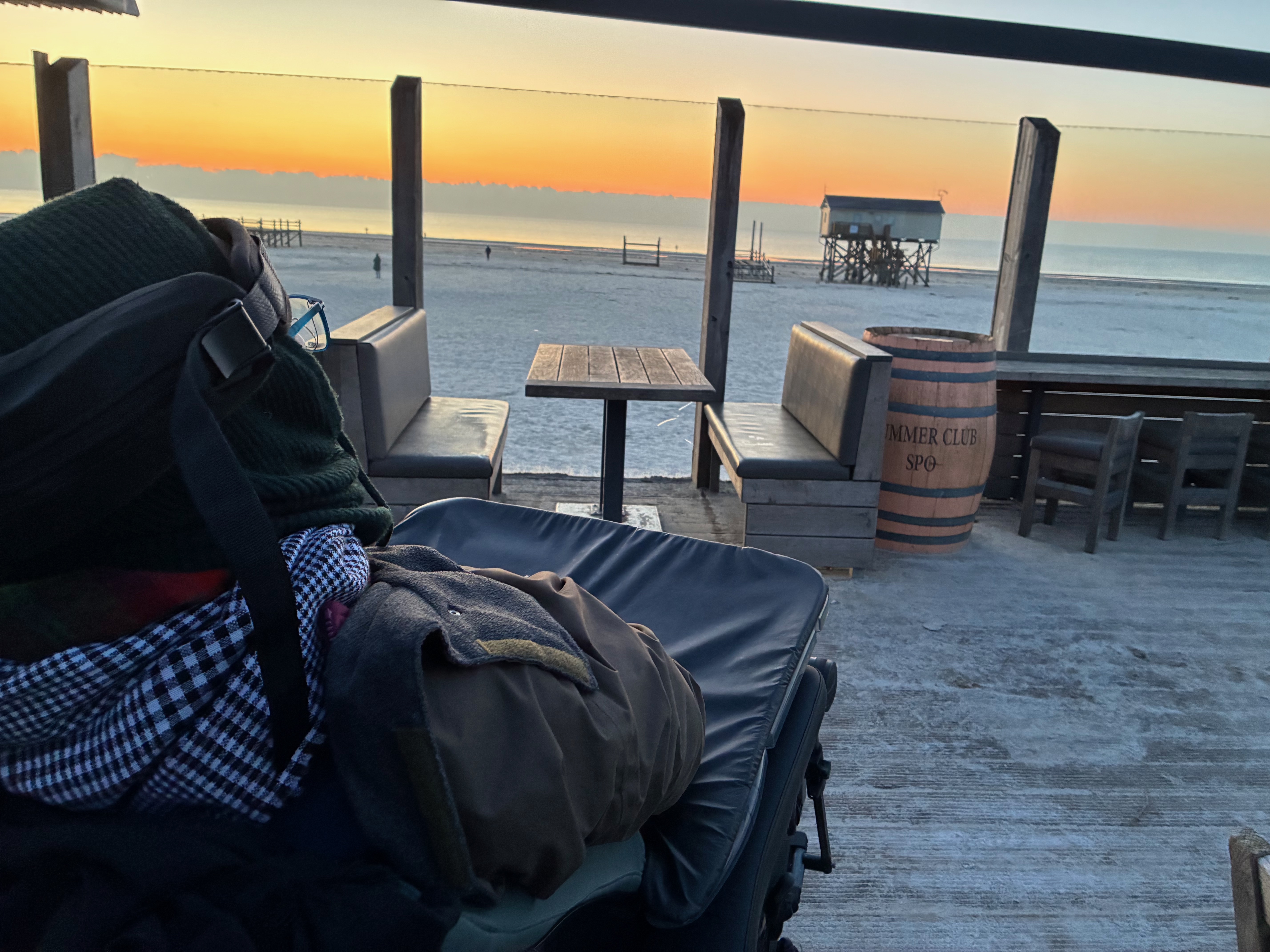 Pádraig had the experience when we went on our usual visit to the Arche Noah restaurant in St. Peter-Ording, at the end of a mile-long wooden bridge. It was freezing cold and the terrace of the Arche which can be reached over a ramp was not operating. To get into the inside restaurant proper, however, you have to get up 10 steps. I didn’t even bother to ask because I was sure there was no way to get Pádraig up those steps.