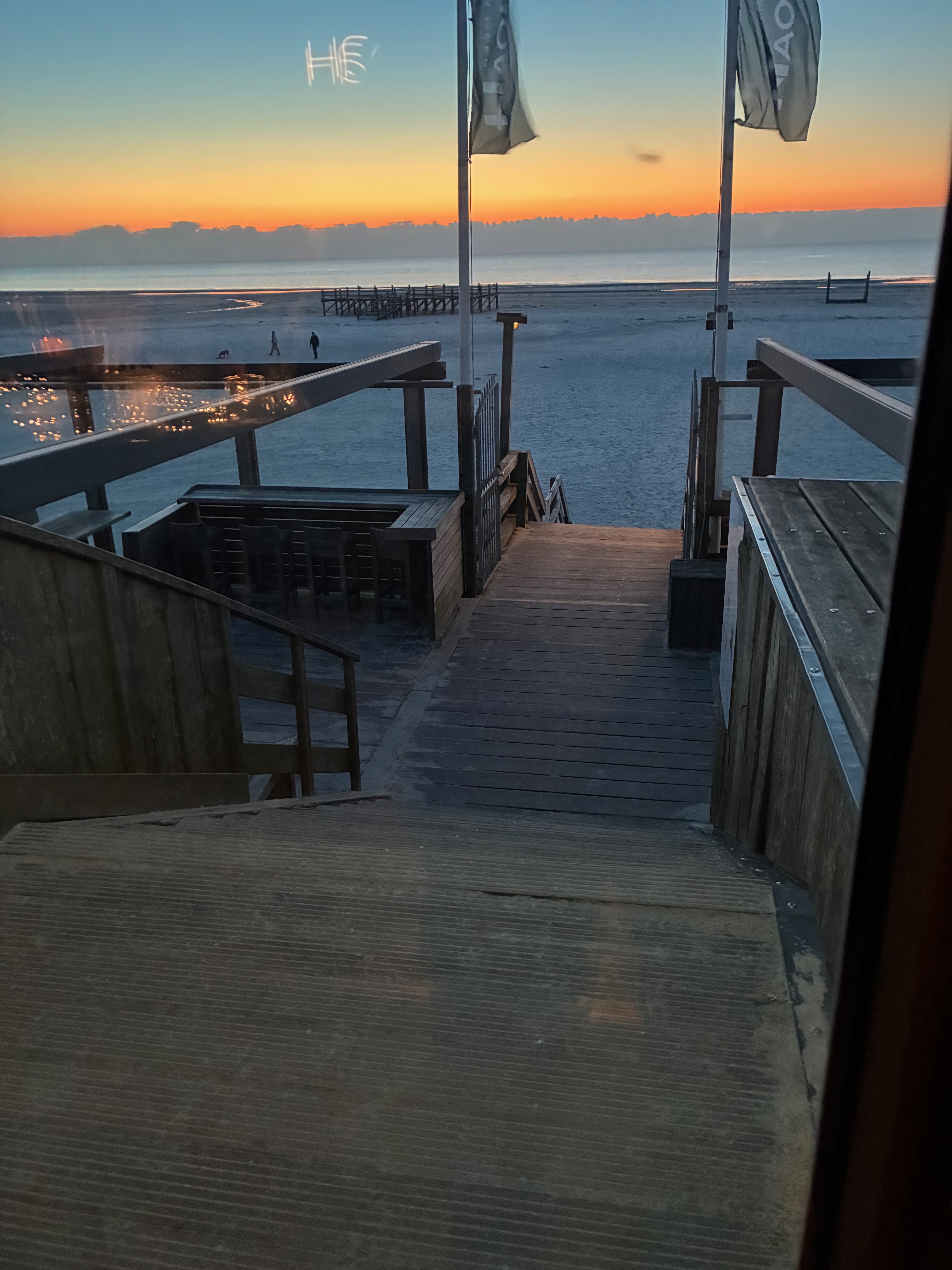 I was still admiring the most beautiful views of the vast sandbank and the North Sea with Pádraig, in the freezing cold, with the sun disappearing on the horizon, when Pat came down the 10 stairs with two waiters, and a minute later Pádraig was on his way up those ten steps. Step by step.