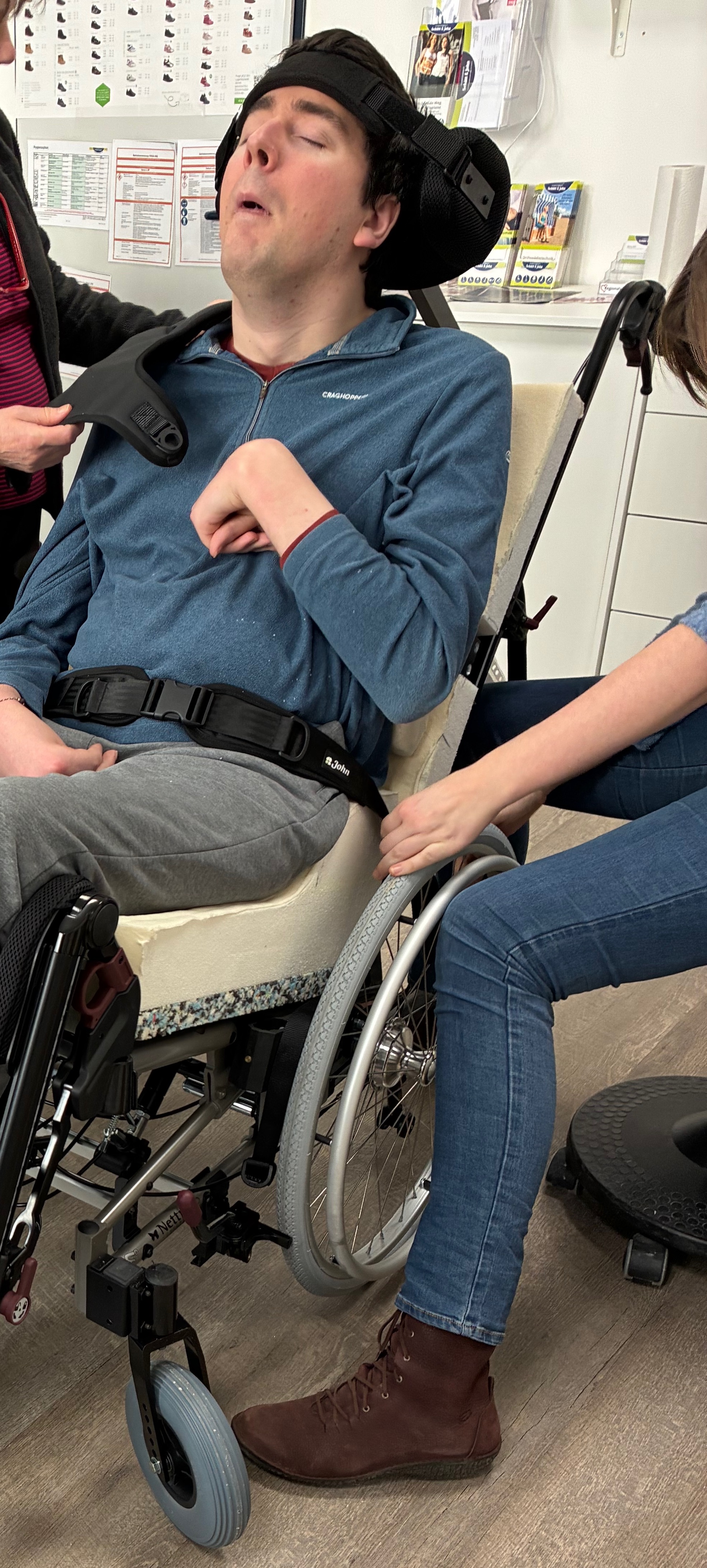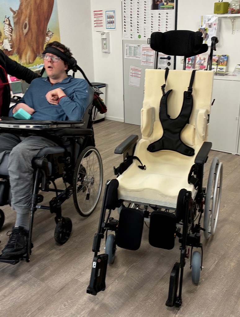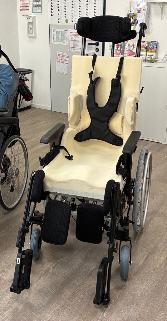 We had three sessions with the nice Orthopädie-Mechaniker in the Sanitätshaus in the North of Germany. First, we checked whether the specially constructed seat and back supports were right and had a chance to adapt them. At the next visit, we made sure that all these adaptations worked and selected the covers.