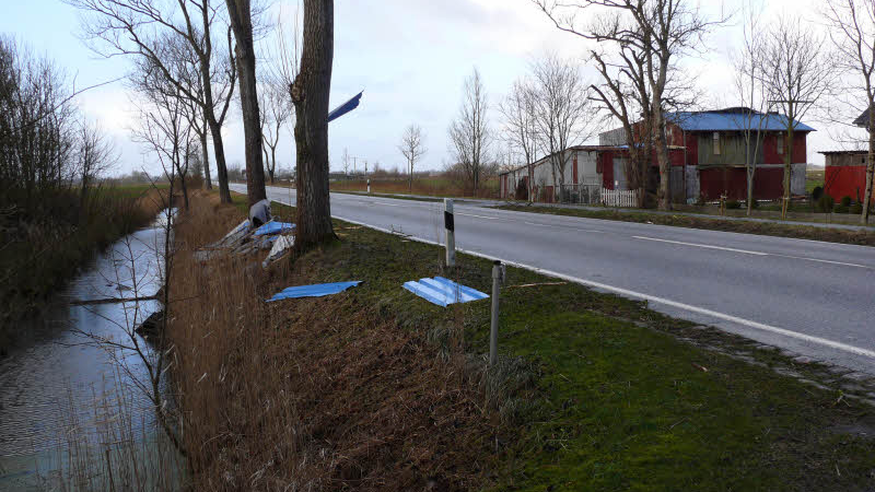 At the same time, Pat and I were driving through a hurricane, Xaver was his name. Good thing was that there was little traffic. Bad thing was that lots of roads were closed, including a stretch between Tönning and Garding, just about 10 km from Tating where we stay. This morning, we found out why when we looked it up in the local newspaper: the wind had lifted off the roofs from garages and sheds, and corrugated iron sheets had been sent flying through the air like magic carpets. They cut off bushes and were lodged cut into trees – being caught in this storm of flying corrugated iron sheets would not have been nice…