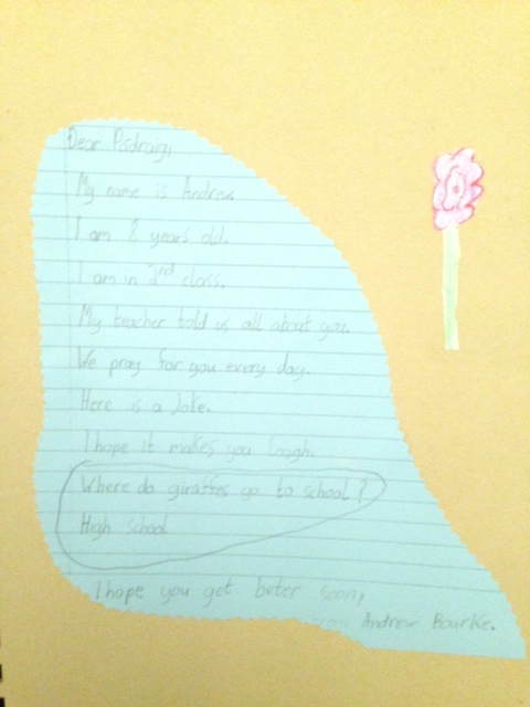 They all wrote letters to Pádraig, telling him that they had heard about his accident, that they are praying for him every day, and – wait – they wrote down in their letters their favourite jokes for Pádraig to cheer him up. Here is a sample: “Why did the Jelly Baby go to school? – Because he wanted to be a Smartie.” If you have children, if you are close to children, or if you are still young at heart, this must be the most moving ‘post’ you could ever get.