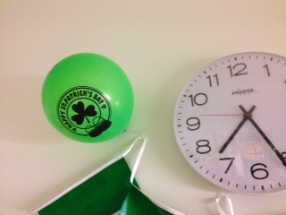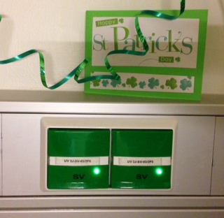So this afternoon, we decorated Pádraig’s room and I took a few pictures. Then, as I was looking around, I noticed that the staff must have been really busy preparing for St Patrick’s Day too: so many green things everywhere: plugs, measuring tapes, linen bags, tubes, lift buttons, charts, even the graphs on the monitors – all had changed to green!!! By now I know how nice the people looking after Pádraig are, but I had no idea that they would go all the way and turn the whole place green, inside out. Still white from the outside – inside, it’s green!!!