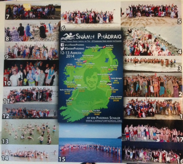 He is, Seos. He is walking the streets, swimming the lanes, having a pint, dancing to the music, singing the songs, playing cards, sitting in the library, checking the TV remote from the couch, organising the next event, ordering t-shirts, writing an article or a letter to the Taoiseach, having breakfast at 5am …. he is with his family and friends. Every Day. Every where. Every time. Gas. – I keep telling him every day that he is. And that he needs to start thinking about stepping out of our minds and get back to stepping onto our toes, to kicking our backsides. To walk, swim, drink, dance, sing, play, read, watch, do, write, be up at 5am – that strange time of night. – Reinhard