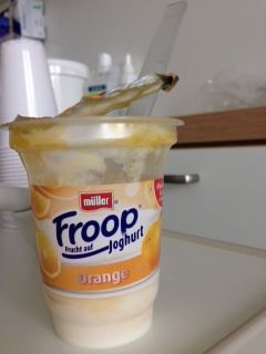 Pádraig is also continuing to eat. Someone told us to try Froop, something like a yoghurt with fruit jelly/flavour. And guess what? It was a huge success. He would have emptied the full tub, but we thought we’ll take it easy… We are already thinking of preparing a little menu plan with a really soft cereal in the morning (like ReadyBrek), something nice at lunch time, and a more savoury dinner. At the moment, he is mostly on the
