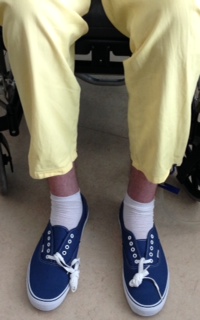 So today, this was another step ahead. Another first. There really is no end, no end, to these ‘firsts’. Boots are made for walking. Shops didn’t have them, ordering online just took two days. Size 15. And sitting in his wheelchair, his feet reached the ground, and firmly claimed that territory! Step by step (mmmhhh), normality is coming back. Socks (we’ll forget for a second that they were white) and shoes (cool ‘Vans’) – where will the next step take him?
