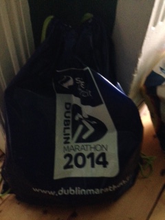 Here’s the bag. Got a lift up to the RDS today to collect it and get all worked up about the big day. I found the map of the new route in there, so I won’t get lost running up the old route up to Phibsborough.