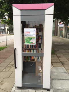 When we went for a walk today, we saw what looked like a new telephone booth. Who on earth would bother putting up a new telephone booth, I thought. So we went to have a look. Turned out that what looked like a telephone booth (Telefonzelle) was, in fact, a book exchange (Bücherzelle). Isn’t that ingenious: the idea is that you can bring your books or CDs and leave them there for others to take it. Volunteers check regularly to make sure that the place is kept in order.