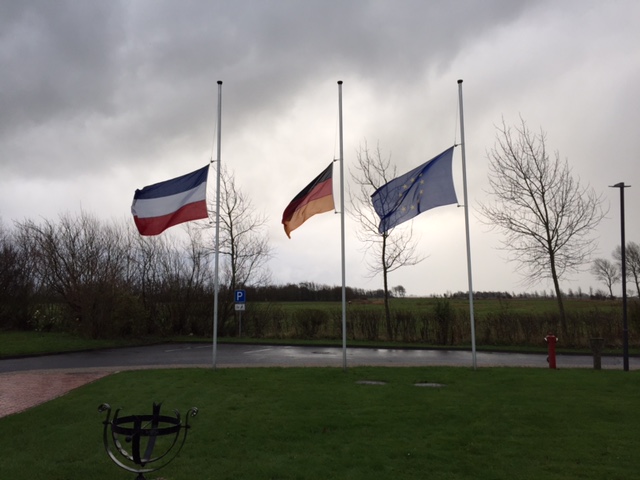 A thousand miles away, I went to the Garding city offices this morning where the flags were flying half mast. I had to check the one on the left – it’s *not* the French flag, but the one of Schleswig-Holstein, the federal state Garding and Tating are part of. They are mourning. For the people who got killed in Paris by senseless violence.