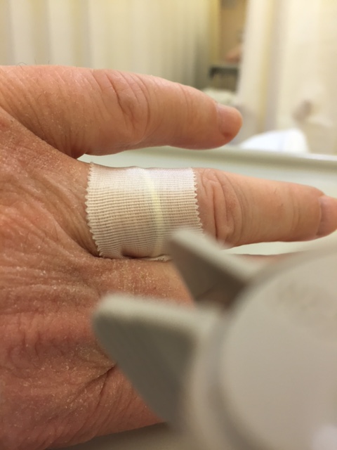 Talking about fingers: here’s a really imaginative solution of a staff nurse for wearing ‘jewellery’ when you’re having an operation, and you don’t want to take it off (because it’s your wedding ring:). Ignore the wrinkles on the hand, it’s the angle the picture was taken from!