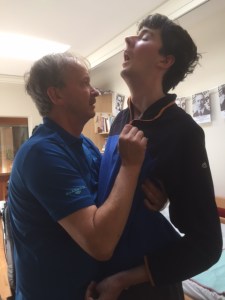 But there is an elegance and a style, a very personal ‘stamp’ Pádraig has been putting on his recovery. His very slow recovery. In a simple, uncomplicated, straight forward way. Yesterday, he stood up, with a bit of help, and held his head up high, without any help. Even though he managed to do this for only a few seconds. Today, when we went swimming, he stood up high and tall in the water, holding on to the side bar of the pool with his hands, and pushing his heels firmly down into the bottom of the pool – and he did this not just once but three times. Elegantly, slowly, and simply just standing up.