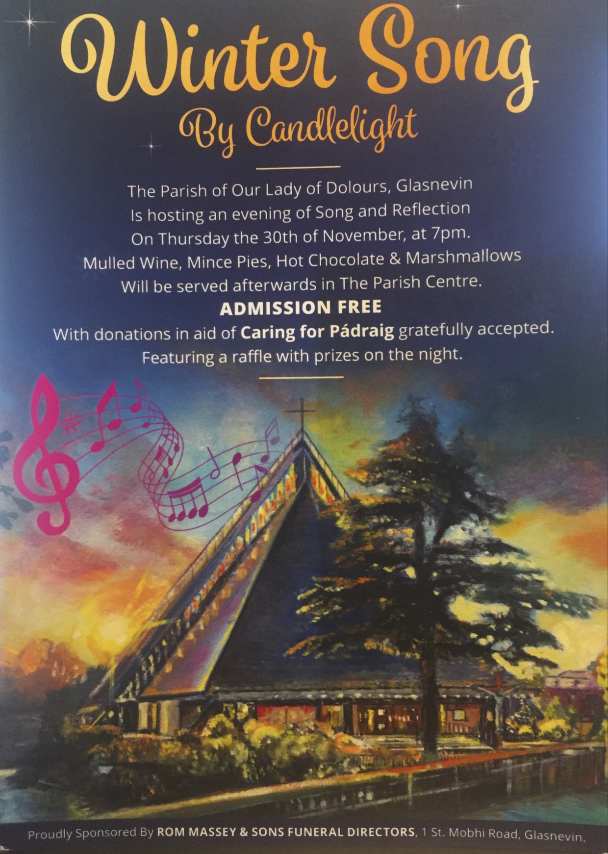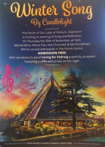Because this coming Thursday, rumours have it, the world-famous Sam Maguire Cup will appear at “Winter Song by Candlelight” organised by the Parish of Our Lady of Dolours, Glasnevin, for “Caring for Pádraig”. – Another reason to join us at 7pm this coming Thursday! (AND: there will be a fabulous raffle with free mulled wine, marshmallows and all sorts of other seasonal goodies!)