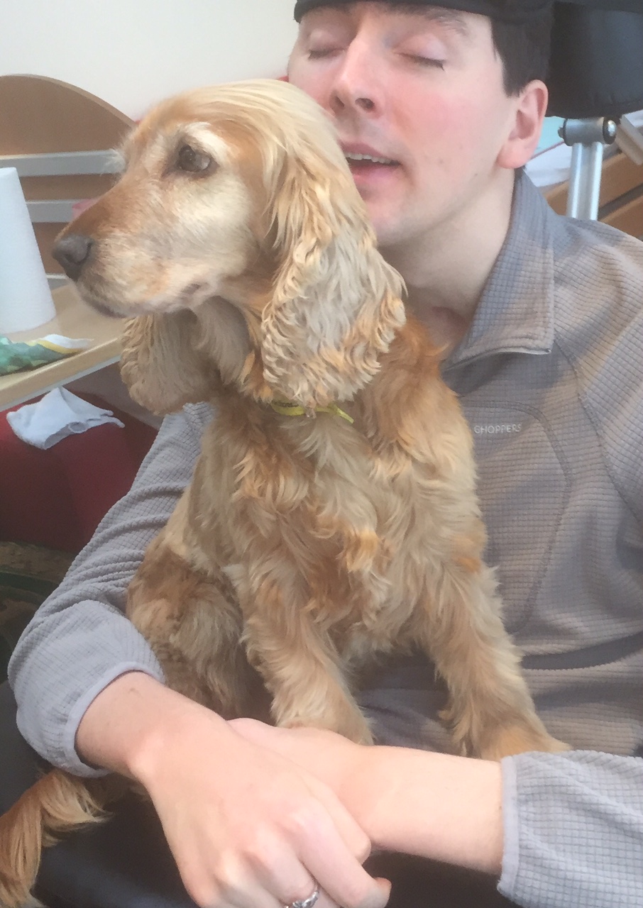 Well, Hello Dolly! She ain’t quite like Barbara Streisand and neither does he have any resemblance with Louis – but both were really really happy together when Dolly came over for a visit with Pádraig’s music therapist. I felt so happy just watching the two. And it made me think again about the beautiful companionship of a (therapy) dog…