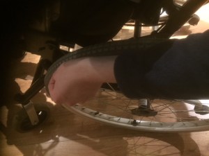 It was completely unexpected. He was just tired to have his arms up on the table. So he moved them back and his hands came down beside him. We put he hands upon the wheel – and when he noticed he could move his wheelchair forward and backward – that is what he did. Sure, it was more a rocking motion than a moving or driving motion. But there was motion. And he had it under control!