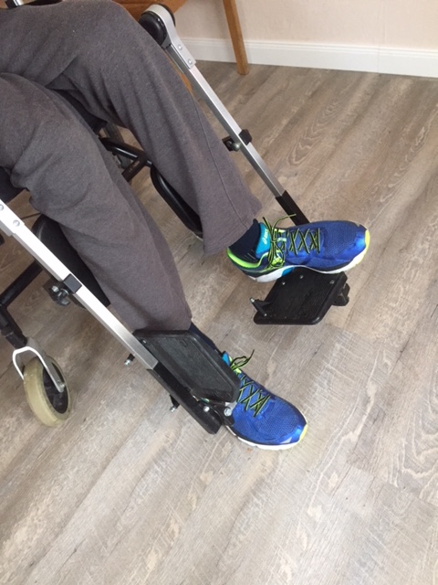 How on earth did this happen? – Check out that picture. Have a close look at it. Pádraig’s left foot is on the footrest (well, kind of…). However, his right foot is on the ground and the footplate on which his foot is supposed to be resting is tilted up. Now, none of us did this. We were going in and out of the room, giving him a drink, something to eat, getting ready to get his teeth washed when, all of a sudden, one of us noticed his foot on the ground with the footrest tilted up.
