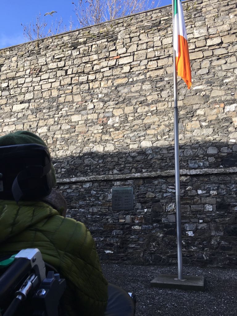 Today Pádraig visited Kilmainham Jail where they had organised a tour, as Gaeilge, for visitors. The old part of the jail is, unfortunately, not accessible by wheelchair. But he made it into the stonebraker’s yard where the executions took place, into the museum part and into the cafeteria.