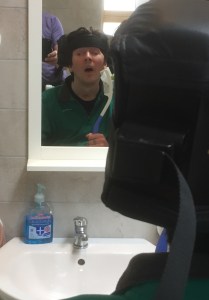 It’s easy to overlook the complexity of what is going on here. He holds the comb, moves it with his hand, lifts up his arm and combs his hair (with help), while watching what is going on in the mirror. He is doing something himself that so far someone else has been doing not just for him but ‘on’ him. The level of autonomy and of taking back control might seem minuscule but is, in reality, enormous. Not least because this is just one of the first steps. And you know what happens when you take the first steps – usually they are just the beginning of a long and wonderful journey.
