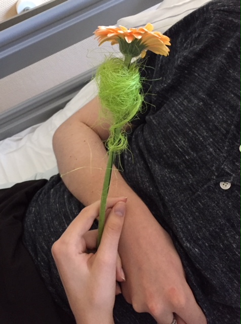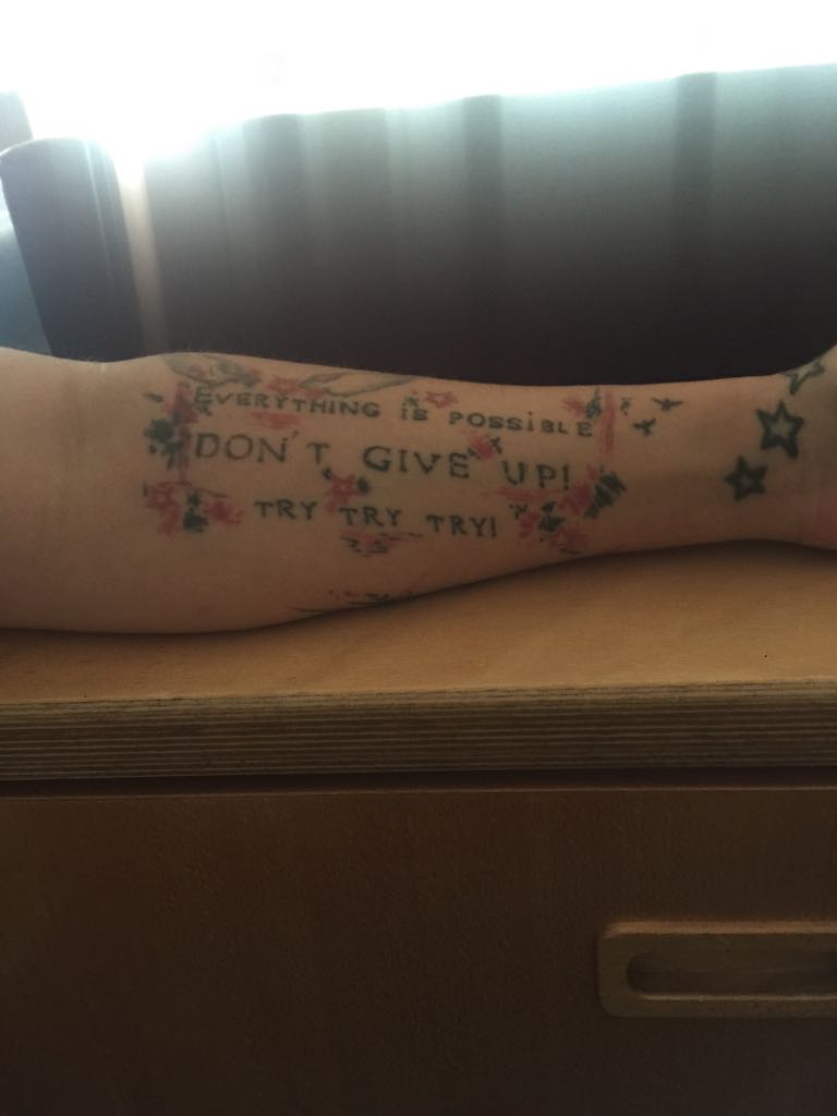 Her accident happened about 10 years ago. Today she can walk (with help and support), she travels with her therapist, she drinks, she smokes, she has a tattoo on her arms, she comes into the therapy centre once a week, and she came over to see Pádraig.