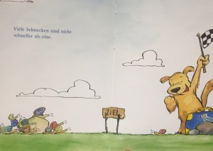 The book is full of pictures about Patrick exploring the world and discovering new and exciting aspects to it. One of the best pictures in my opinion is the one that says that “many snails are not faster than one”.
