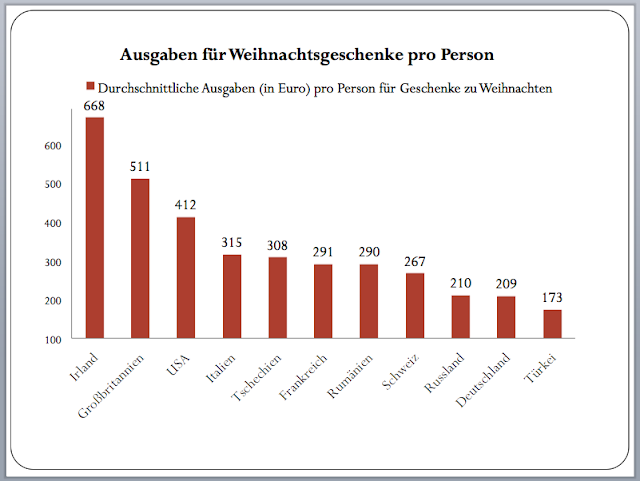 But Ireland is most definitely leading the field when looking at how much people spend on Christmas presents per person. More than three times as much as the Germans!