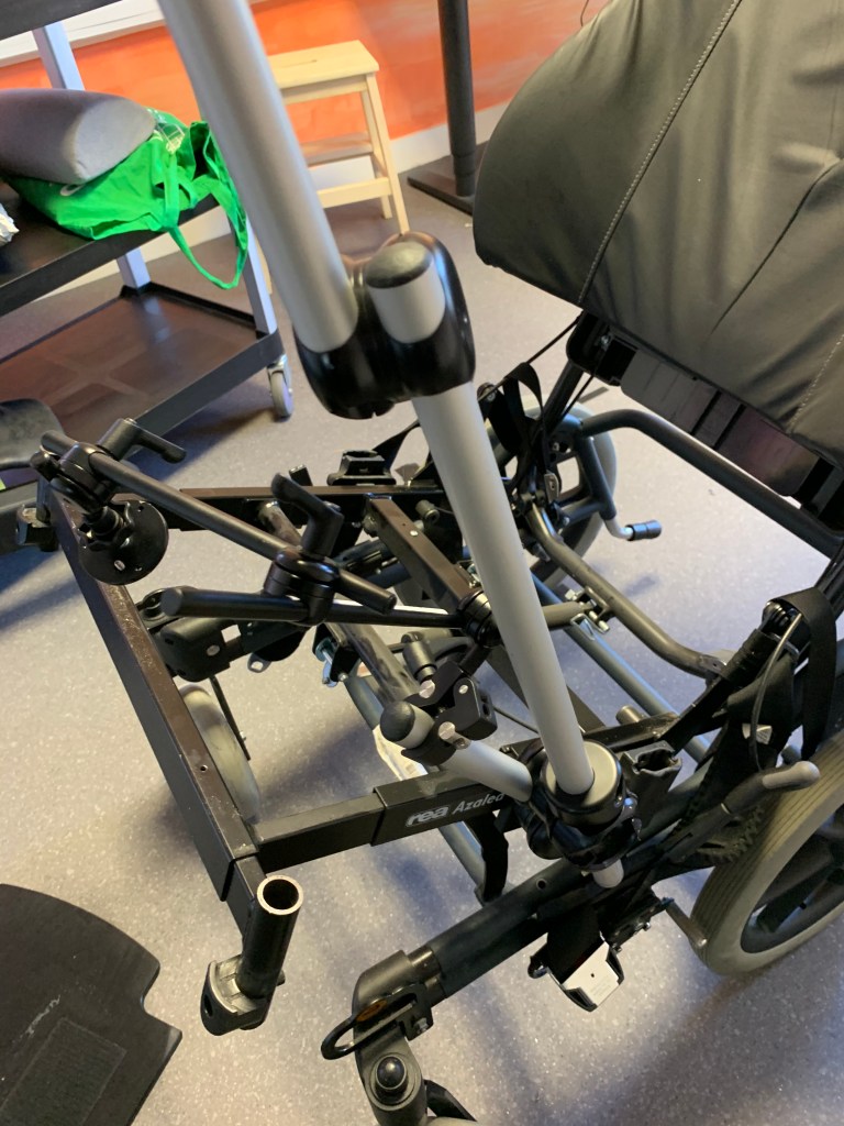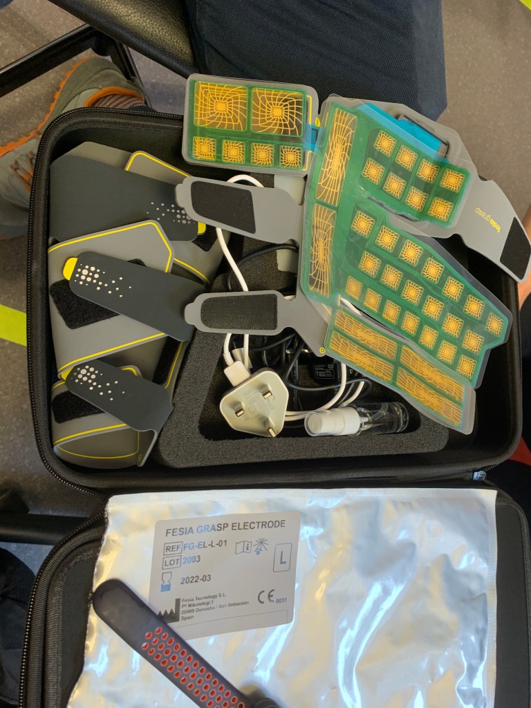 Pádraig’s wheelchair got a new fitting to position a switch above his knee. He tried out a Mollii suit. A Saebo glove. And got a brief intro into the sophisticated Fasia glove with tons of e-stimulation contacts and settings.