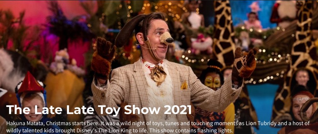 Ryan Tubridy said on Friday’s Late Late Toy Show that one cannot understand the Show unless you’re Irish or have been living in Ireland for some time. I don’t agree. What about people who don’t think that the promotion of an abundance of (more or less) throw-away toys and show performances by kids dressed and acting like adults, with the occasional awe-inspiring pop or sports star thrown in is fun? Never mind appropriate when beginning to prepare for Christmas?