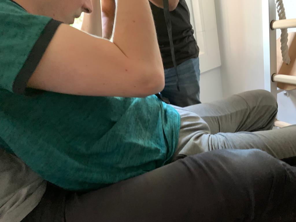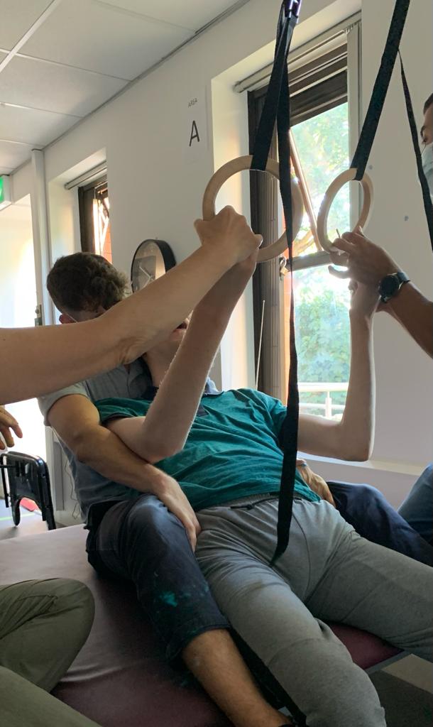 An Saol got a ‘Swedish ladder’ which was used by one of the therapists to do some upper body strengthening exercises with Pádraig. To our surprise, he managed to hold on to the rings (with just a little help) and pull himself up from a half lying position to sitting. When I looked a bit closer, I was amazed by the muscles in his upper arms. Maybe, I should just stop to be surprised. Maybe, Pádraig just needs to be given the opportunity to show what he is capable of every day, with new challenges, creativity and ambition. Hut ab!