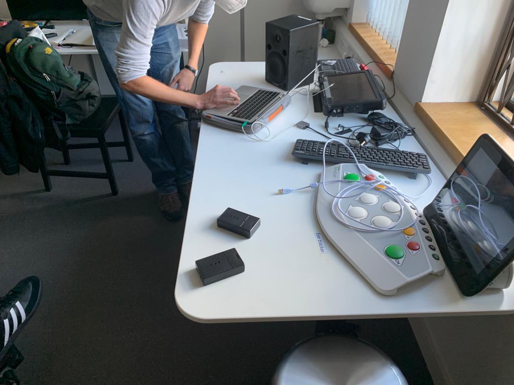 A music technology lecturer working on his PhD came in to try out some of his ideas with Pádraig. He used switches from a Logitech Adaptive Gaming Kit – which costs a fraction of what the ‘medical’ switches cost. And he had created sound interfaces using a Microsoft Xbox kit.