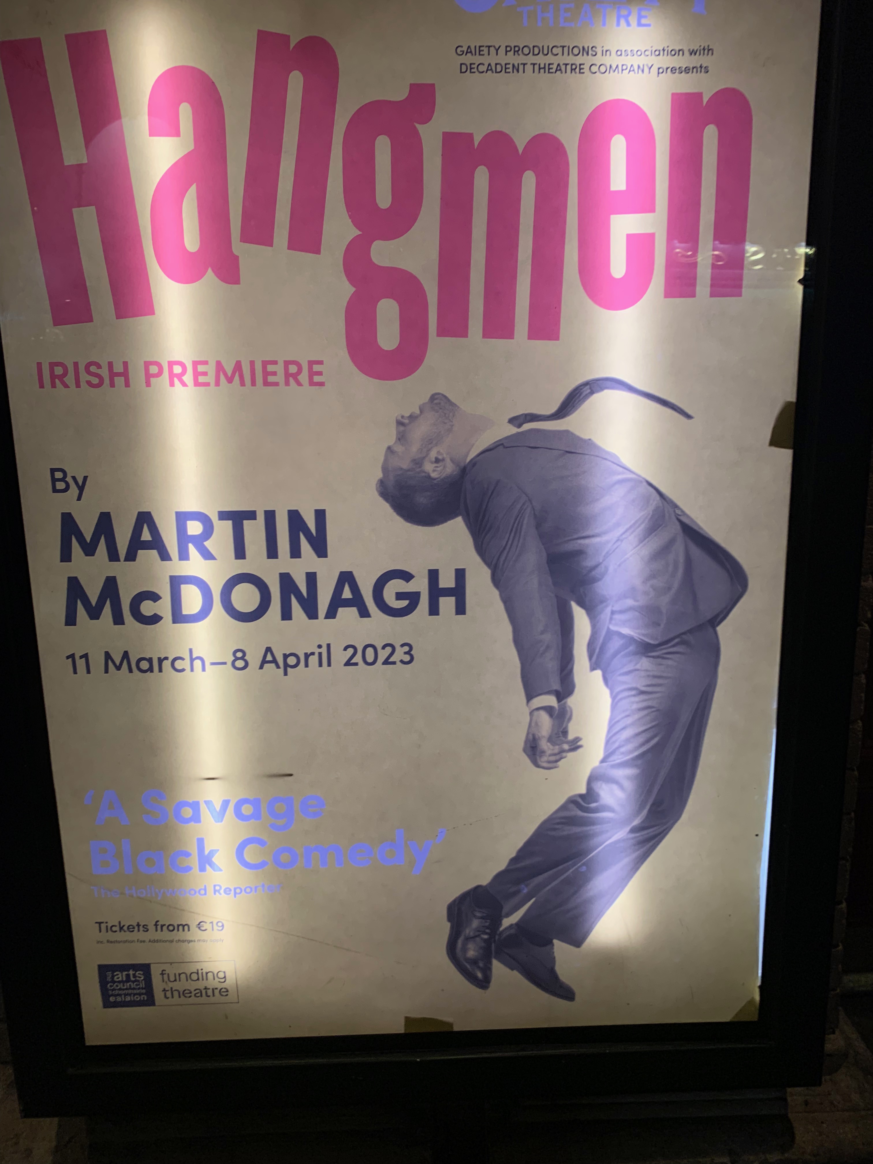 Pádraig likes Martin McDonagh who made several great movies, including In Bruges, Three Billboards Outside Ebbing, Missouri, and, more recently, The Banshees of Inisherin. He also produced a play called Hangmen which premiered in London in 2015 and now made it, just eight years later, to Dublin.