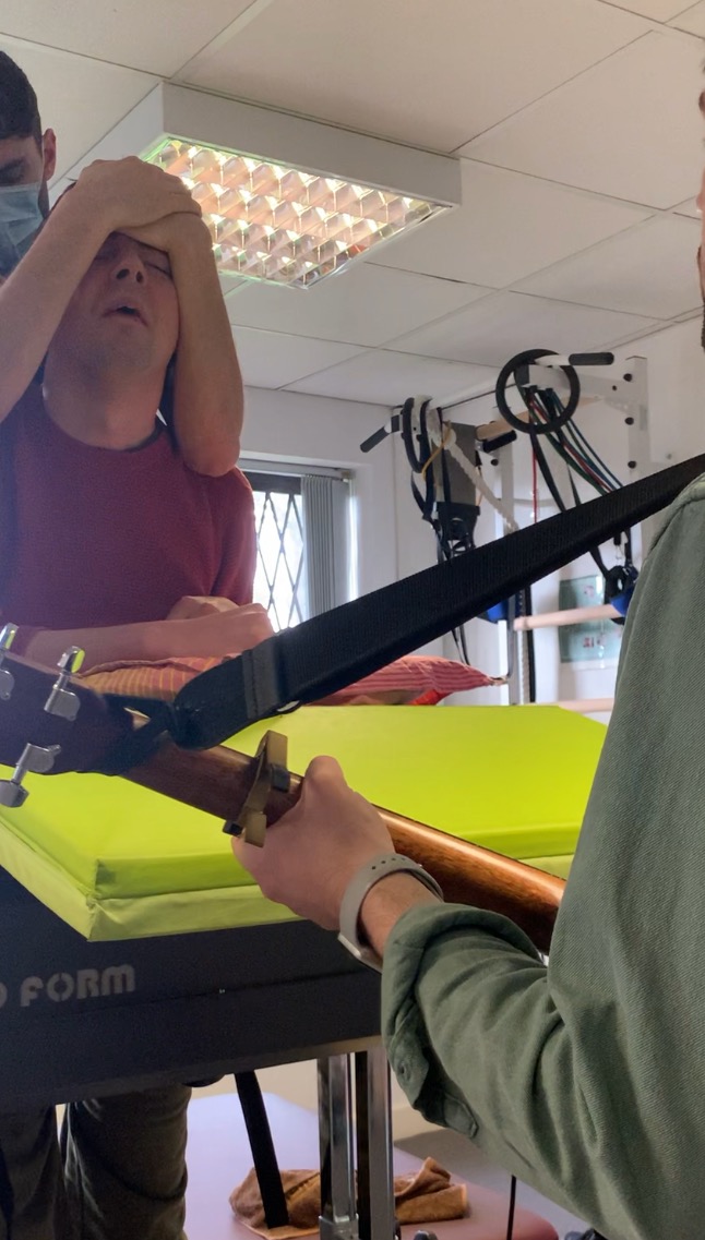 For the second time in two weeks, Pádraig had a music therapy session standing up. It seems like a brilliant idea. Few professionals sing sitting down in a wheelchair. The lungs are much more open and the air flows so much better when you’re standing. For Pádraig trying to produce sound, it must be similar. We’ll keep trying.