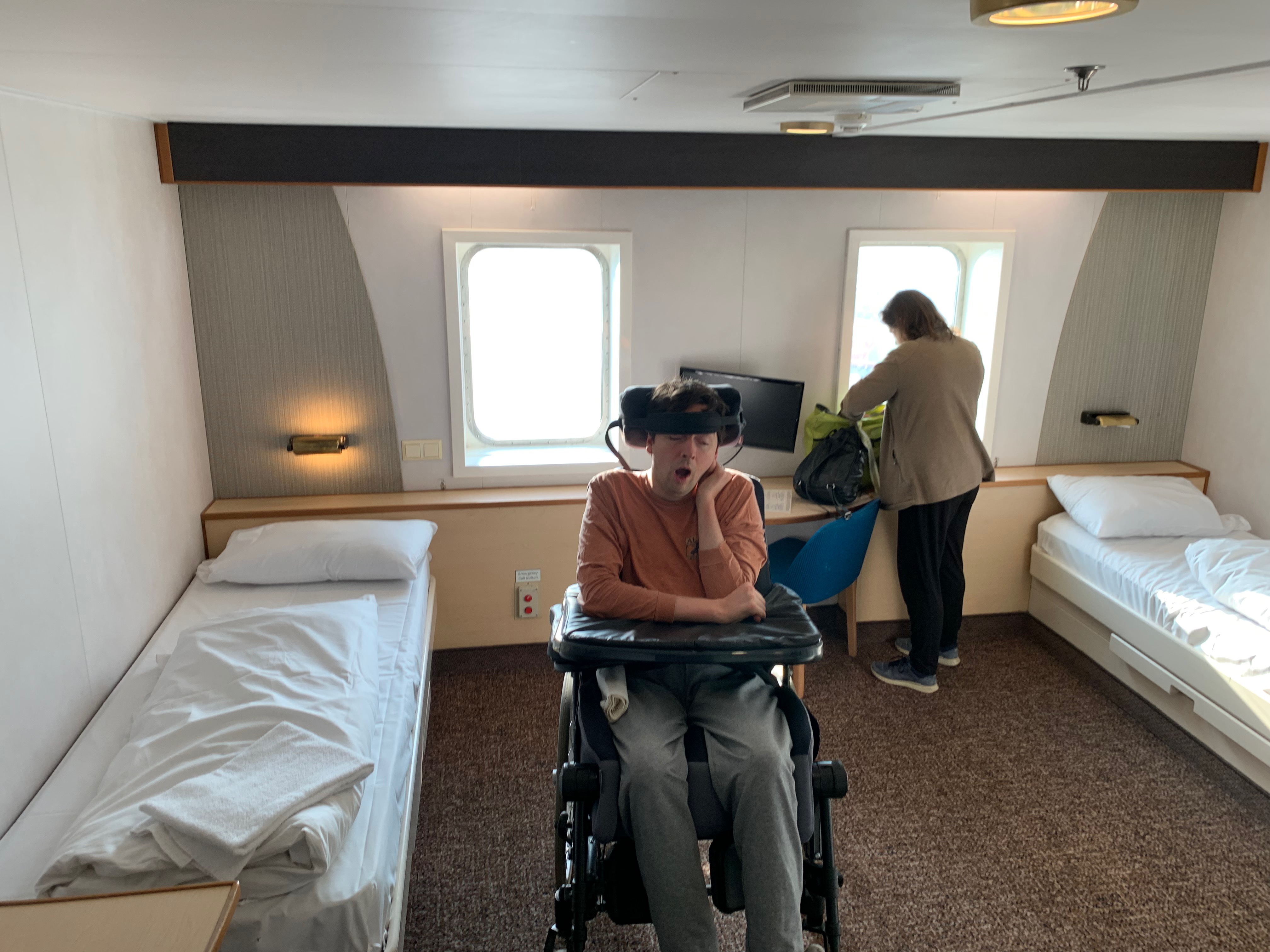 We got onto the ferry early which was great. No queues and plenty of space to get everything organised to move up into the cabin. And what a pleasant surprise: Stena’s accessible cabin has to be recommended. Rarely are cabins that generously sized. Plenty of space to move the wheelchair around.