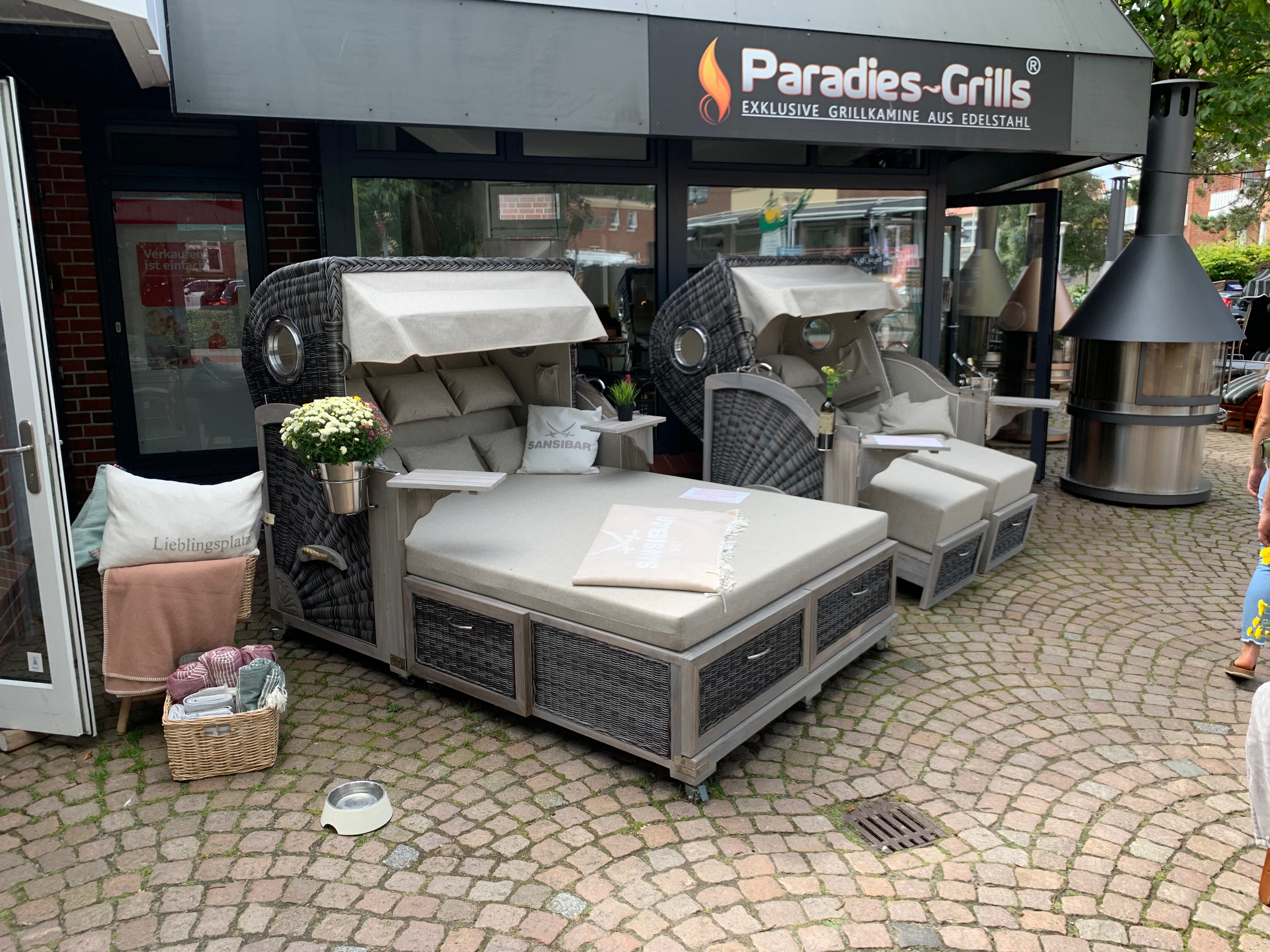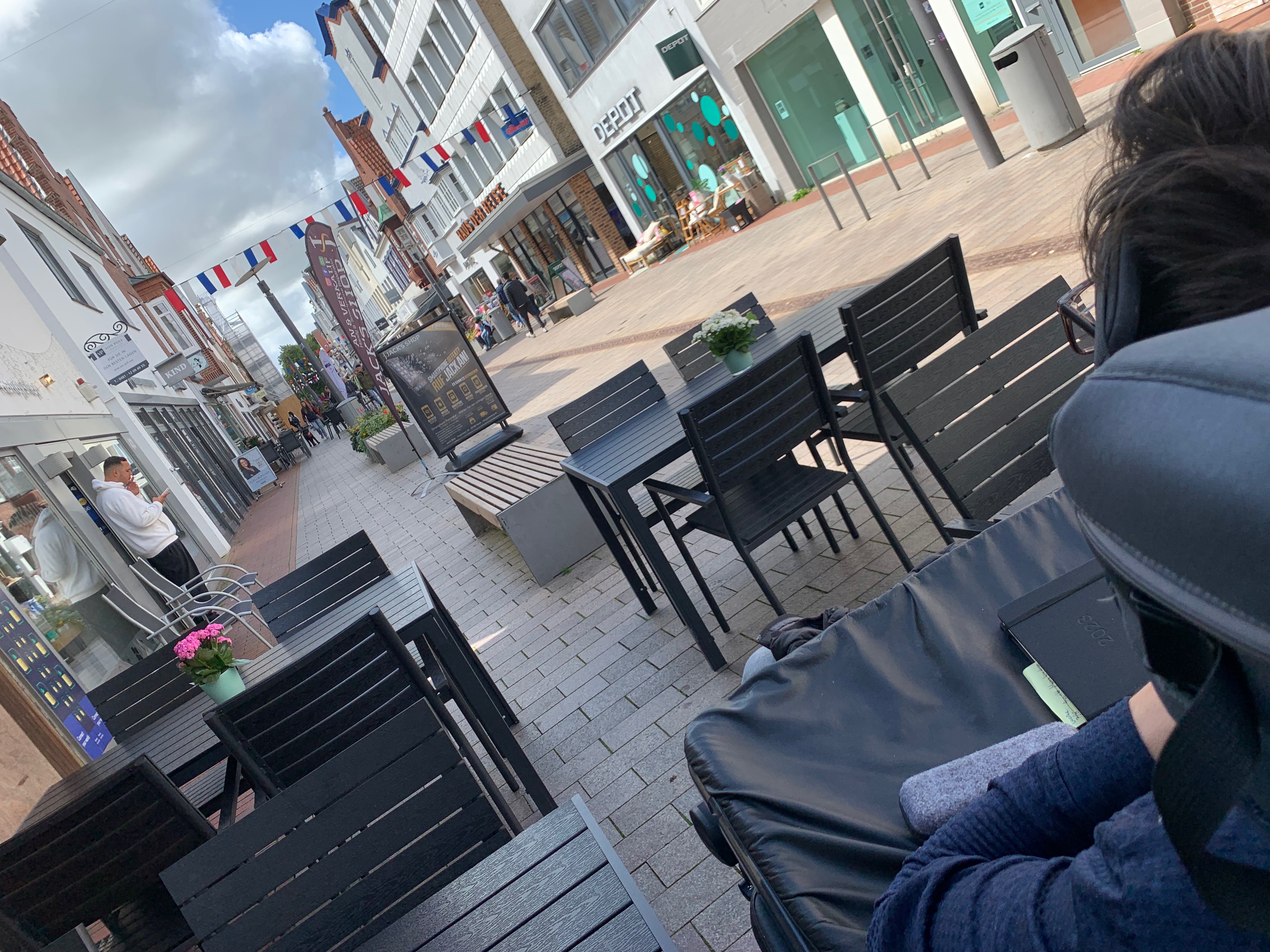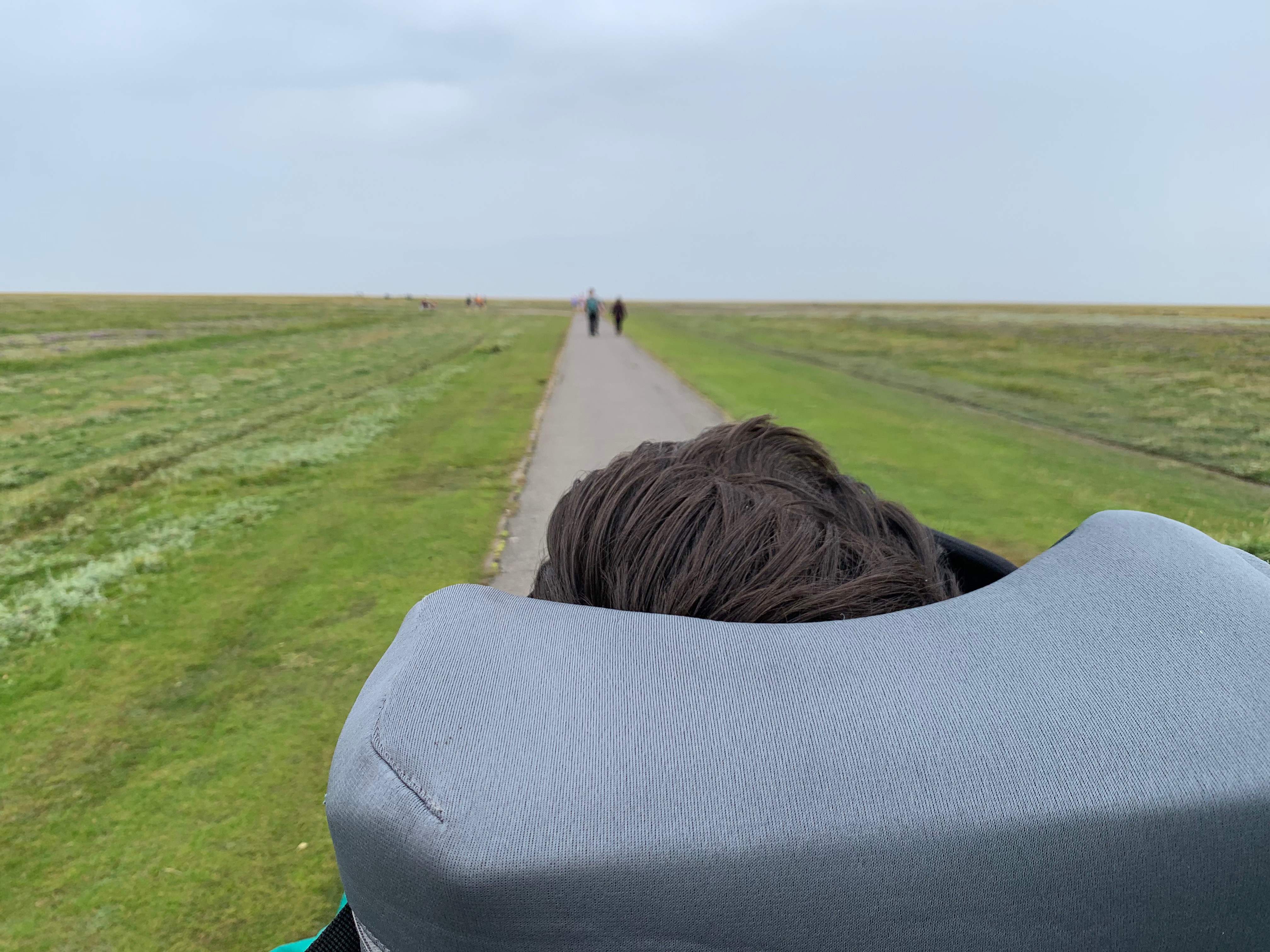 On our walks, we met old and new friends; Irish-type signposts; a “Kältekabine” where you test your jacket to make sure it is cold- and wind-resistant; a kite-surfer traffic jam in the sky; Husum Harbour attracting melancholic tourists longing for the liberty of the seas; fancy rest places in hammocks and a super-sized Strandkorb; ambitious therapists; and beach-going wheelchairs.