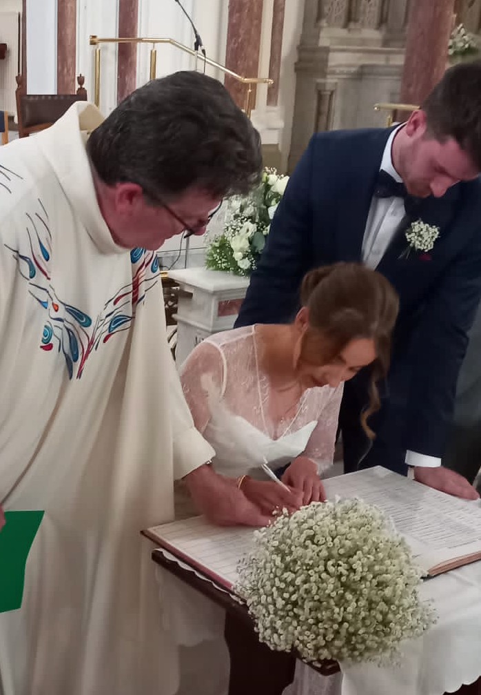 The first pictures of the Bride were taken in our back garden. After that, we went across the road into the church which I had never seen as nicely decorated with stunning flower arrangements. The civil register was signed by the happy couple in the Church, as well as by the official witnesses, including Pádraig. He had practiced his signature and did a brilliant job on the day.