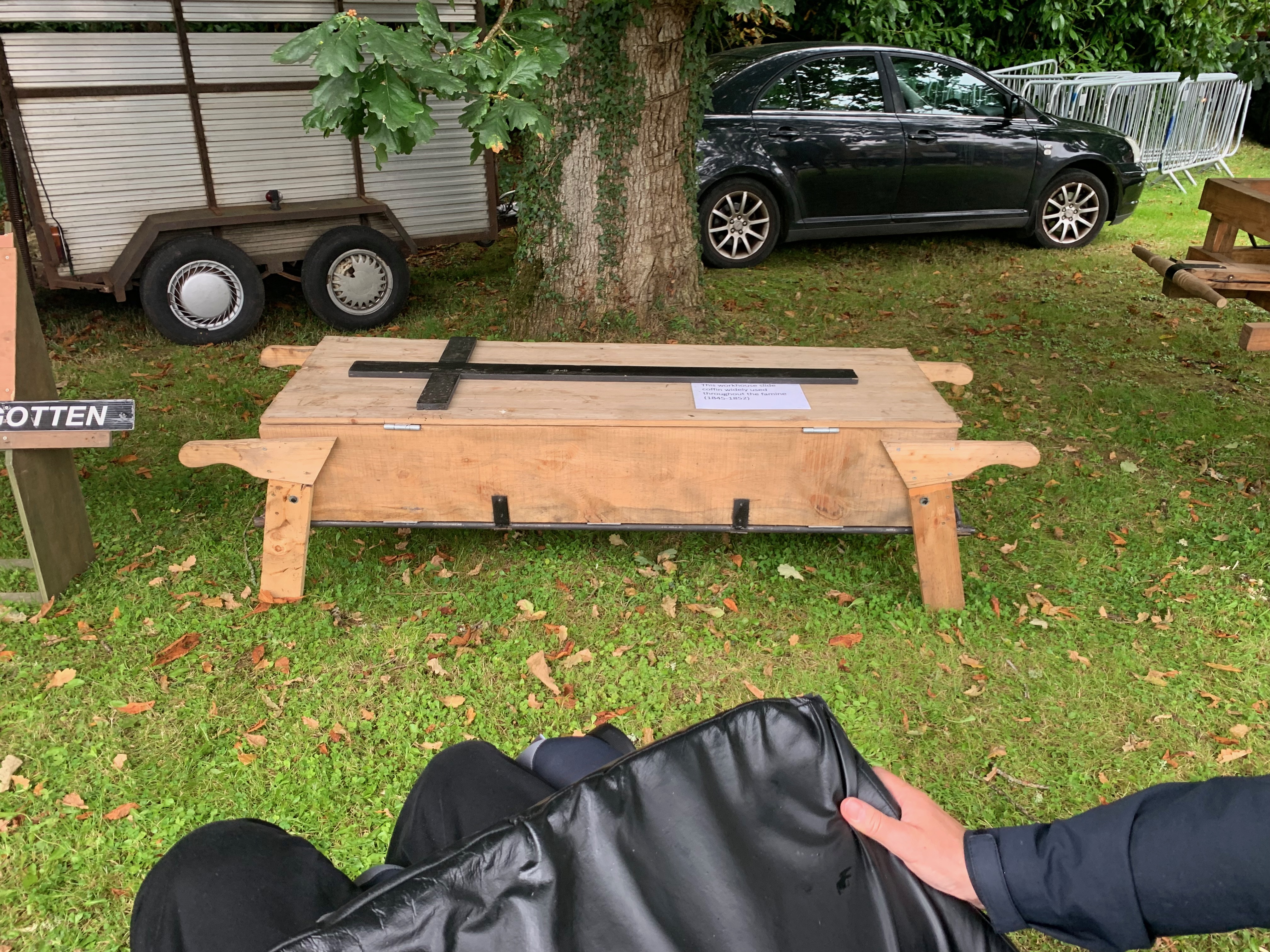 There were the usual exhibits: old tractors and tools. But also the almost exact Volkswagen Beatle we drove from Dublin to Madrid the day after our wedding; a real Spanish Churros outfit, a 20 euro Dublin millennium milk bottle, and, probably the most disturbing item, a famine coffin. The coffin, with a big black cross on top, had flaps underneath that were opened when the coffin stood over the grave. The body fell and the coffin was carried away to pick up the next dead body.