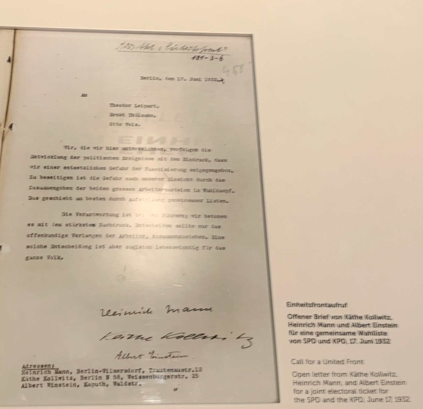 Amongst the items exhibited is a letter signed by Albert Einstein, Käthe Kollwitz, and Heinrich Mann, urging the democratic parties on the left to unite against fascism as the only way to defeat it.