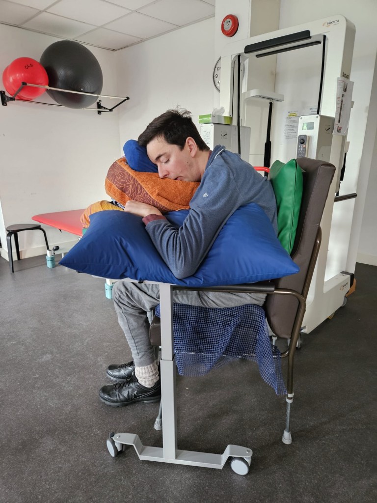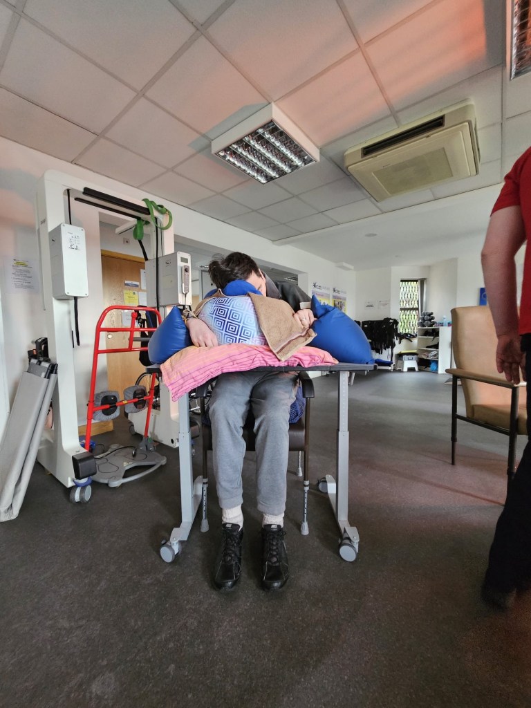 Pádraig is continuing to work hard with Kay Coombes and with the brilliant support from the extraordinary staff at the An Saol Foundation Centre in Santry. One of the current goals is to support the strengthening of is upper body, including his neck – sitting in an ordinary chair, not the wheelchair, with plenty of support from the front.