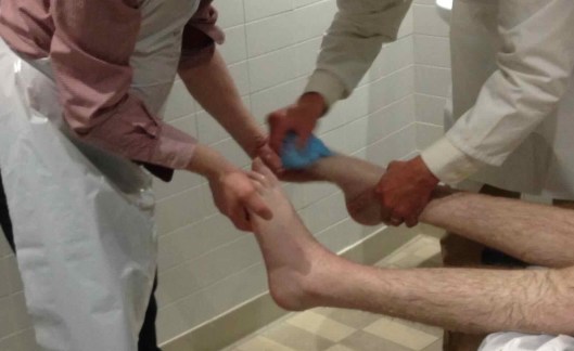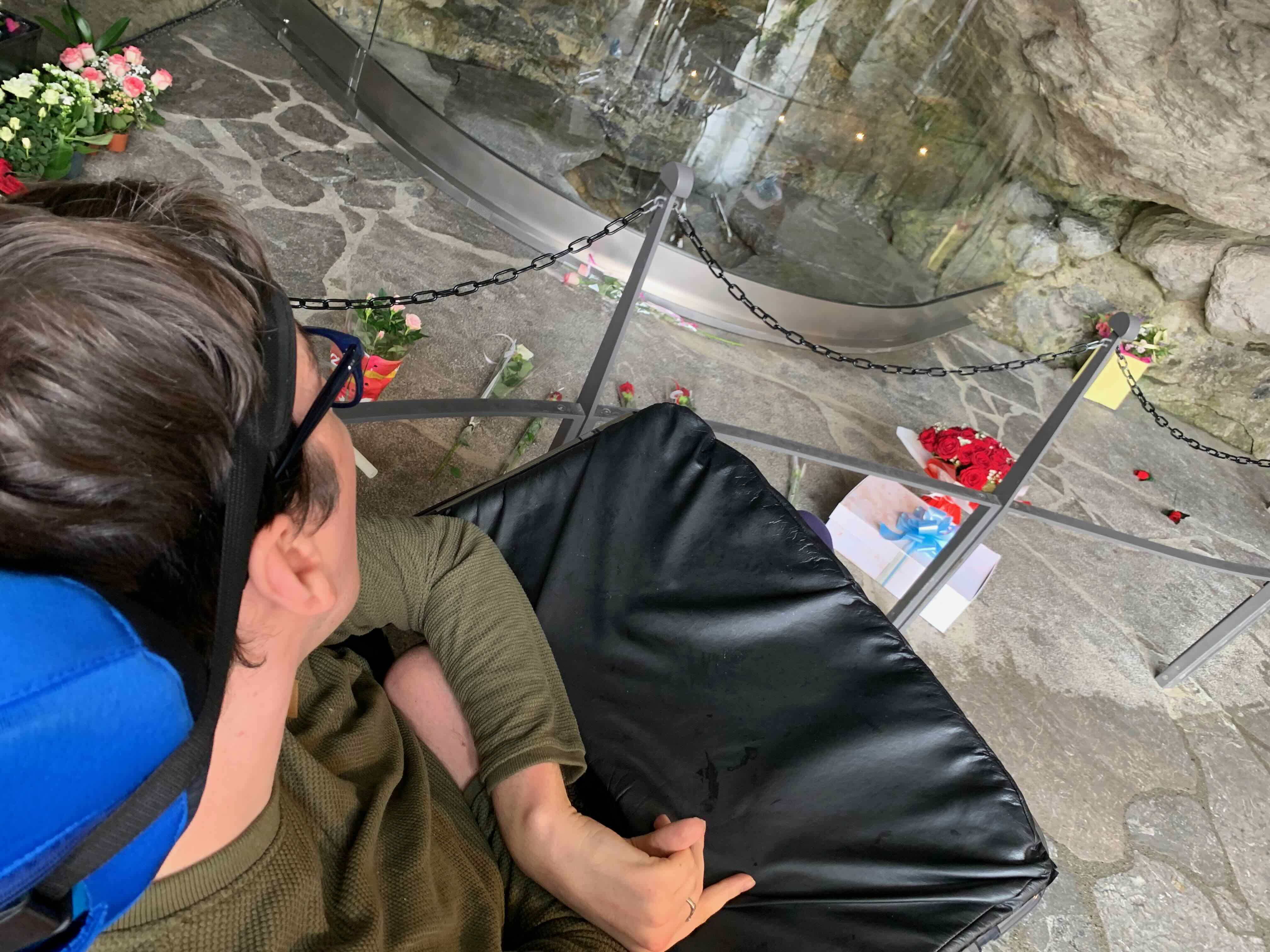 They brought it to the Accueil‘s large accessible bath and shower room on the second floor where Pádraig, on a waterproof plinth, and all of us who participated in the action, had an incredible, spiritual experience. With an unexpected ending.