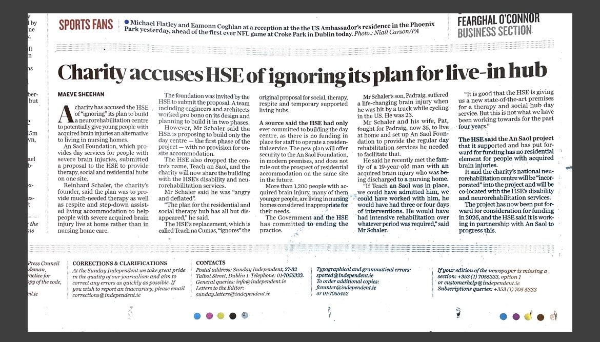 I will also share with you the response we just received from the Irish Health Service Executive to this powerful call for a National Centre for Life and Living with severe Acquired Brain Injury — a centre integrating Therapy, Social, Respite, and Temporary Supported Living hubs. This response arrived only last week, after years of dedicated and tireless work by so many on behalf of those left behind for far too long. It offers new, dedicated space for the current operations of the An Saol Foundation — but, regrettably, makes no mention of Teach An Saol, neither in name nor in concept.