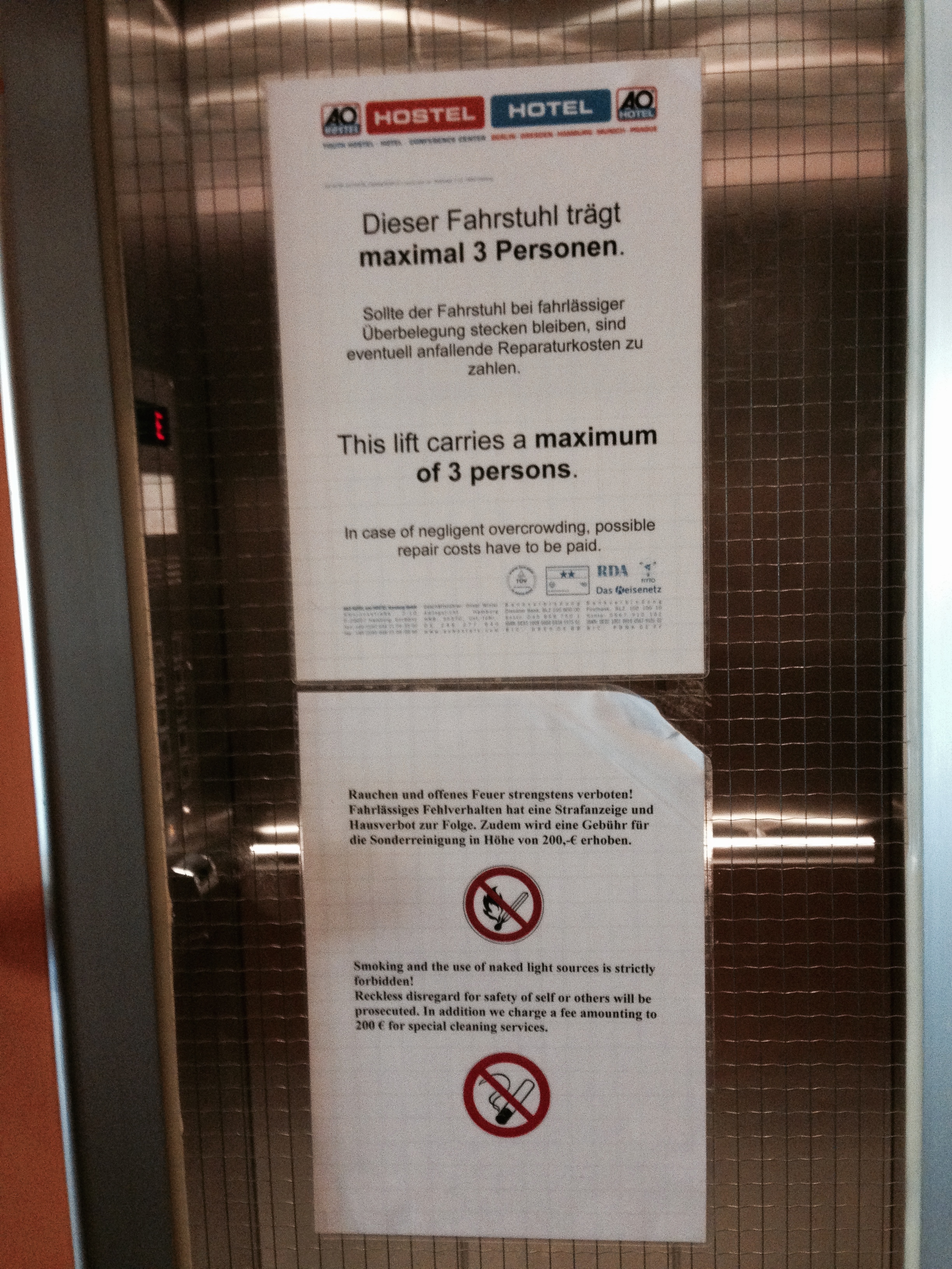 Threatening sanctions in case of Negligent Overcrowding – the lift in the A&O Hostel, a year ago tonight.